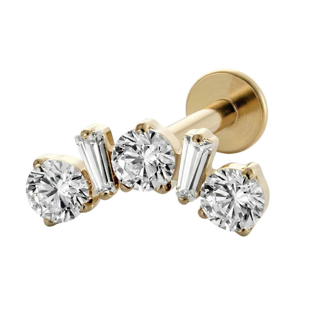 Boucles d'oreilles avec filetage externe ils ont un fil à la surface de la tige qui peut endommager les tissus. Ils ne sont pas recommandés pour de nouveaux piercings.